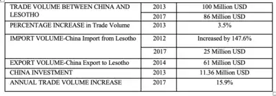 Lesotho is in a trade deficit with China. Between 2002 and 2009 China restricted imports to fewer than two million compared to the 51 million Lesotho imported.[1] In 2004 “Chinese export of clothing and textile products from Lesotho to the world stood at US$ 494,155,000”.[3] This increasing import level into Lesotho from China is positive for local low-income consumers as it reduces cost and increases variability of goods and services. It is important to note however that for the economy this is a detriment.