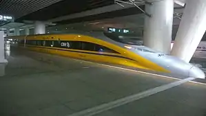 The CRH380A Hexie (simplified Chinese: 和谐号; traditional Chinese: 和諧號; pinyin: Héxié Hào; literally: "Harmony") is a Chinese electric high-speed train that was developed by CSR Corporation Limited (CSR) and is currently manufactured by CSR Qingdao Sifang Locomotive & Rolling Stock Co., Ltd. As a continuation of the CRH2-380 program it both replaces foreign technology in the CRH2 with Chinese developments and increases its top speed.[2] The CRH380A is designed to operate at a cruise speed of 350 km/h (217 mph) and a maximum speed of 380 km/h (236 mph) in commercial service. The original 8-car train-set recorded a top speed of 416.6 km/h (258.9 mph) during a trial run.[3] The longer 16-car train-set reached 486.1 km/h (302.0 mph).[4]