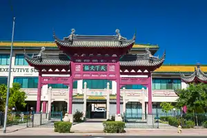 The Chinese Cultural Center (Chinese: 鳳凰城中國文化中心), now the Outlier Center, was a Chinese-themed retail complex in Phoenix, Arizona. It was developed in 1997 by BNU Corporation, a subsidiary of COFCO, a Chinese state-run enterprise and the country's largest food processor, manufacturer and trader.[1] Although the center was developed as a for-profit investment by its owners, it was portrayed as a "cultural center" for the Chinese community in the greater Phoenix area. The developers thought the traditional Chinese architecture and landscaping, its concentration of Chinese-related businesses, and its use as a venue for celebrating Chinese holidays would attract both tourists and local Asian-Americans, and make Chinese business people feel more at home and welcome in Phoenix, thus helping Phoenix attract more foreign investment. The center opened in 1998 with visual elements imported from China and installed by Chinese craftsmen. It struggled with low occupancy, suffered further during the recession of the mid-2000s, and never recovered. In 2017, a new owner announced the property would be repurposed as a modern office building and the distinctive Chinese roof would be removed. This led to a sustained multi-year effort by the Chinese-American community to block the redevelopment and preserve the center as it was built. Despite demonstrations, petitions, lobbying, and several lawsuits, the new owner ultimately prevailed and all Chinese elements were gone by 2022.