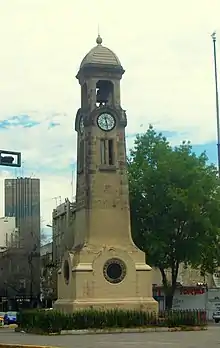 Another area which formed a well-defined Chinese community was Mexico City. At the turn of the century, there were only 40 Chinese registered here, but by 1910, there were 1,482.[42][43] By the 1920s, the community, centered on Dolores Street just south of the Alameda Central and Palacio de Bellas Artes, was firmly established and growing.[34][44] One reason for this was that at the beginning of the Mexican Revolution, many Chinese in the north migrated south to here, both to flee the violence and the growing anti-Chinese sentiment. These people joined with the Chinese already living in the capital, who had businesses in which to employ the “new Chinese.”[45] The Chinese community expanded by forming new businesses in and around the historic center of the city. One common business was the “café de chinos” or Chinese restaurantes serving both Chinese and Mexican food. These can still be found in Mexico City today.[46] One area outside of “Barrio Chino” which became home to many Chinese business was Avenida Bucareli (Bucareli Avenue). Here a clock was built and donated by the Chinese community to commemorate the Centennial of Mexico's Independence in 1910. The original was destroyed during the Decena trágica of February 1913, but it was replaced.[47]
