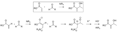 The Baylis-Hillman reaction is a route for C-C bond formation between an alpha, beta-unsaturated carbonyl and an aldehyde, which requires a nucleophilic catalyst, usually a tertiary amine, for a Michael-type addition and elimination. The stereoselectivity of these reactions is usually poor. Lanthanum(III)-containing CLAs have been demonstrated to improve stereoselectivity. Similarly, a chiral amine may also be used to achieve stereoselectivity.[10]