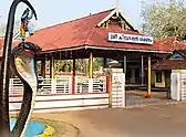 The sreekovil or sanctum sanctorum is square in shape, with a pyramidal roof covered with copper plates. Similar to the idol at Guruvayoor, the idol of Lord Krishna faces east in standing posture with 4 arms, carrying the conch named Panchajanyam, Sudarshana Chakra, Lotus and Gada. There is a small shrine of Lord Shiva and Lord Ganesh to the right of the inner sanctum. The outer sanctum is built with tiled roof, houses the temple kitchen, storage and preparation areas. The shrines of Ayyappan, Naga, brahmarakshas and Bhagavathi are located outside the outer sanctum, but within the complex. The shrine of Lord Hanuman is located outside the west entrance to the complex. The temple pond, called Agnihotratheertham lies to the north of the complex. There is a huge statue of kaaliya mardanam, where Lord Krishna is shown standing on the hood of a huge serpent. This is in reference to the legend of the serpent Kaliya being banished by Lord Krishna.
