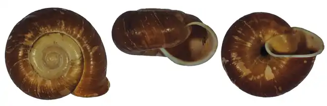 The shell is large for the genus Chloritis. It is brown, hairless, not completely flat, umbilicated. The ends of the peristome are connected with a thin callus.[2] The width of the shell is 40–46 mm.[2]