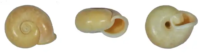 The shell is solid, unicolored light ochre, biconcave, irregularly striated according to some growth lines, with numerous hair pits covering the whole surface.[1] The spire is deeply sunken.[1] The shell has 3¾-4½ whorls.[1] Whorls are rounded, first whorls very narrow, the last one very large, and partly embracing the preceding one, distinctly descending in front.[1] The umbilicus is deep, and about 1/8 of the width of the shell.[1] The aperture is crescent, a little oblique, peristome thick and expanded all around and is somewhat reflexed; both ends connected by a quite thin callus.[1] The width of the shell is 17.1-19.9 mm.[1] The height of the shell is 9.5-11.7 mm.[1]