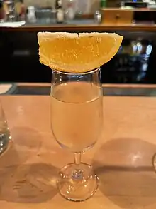 The Chocolate Cake is a novelty shooter which combines the flavors of Frangelico liqueur, lemon, and white sugar to create the convincing impression of a chocolate cake.[1] Sucking the sugared lemon tends to concentrate the flavor of the Frangelico.