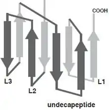 At the level of the primary structure, cholesterol dependent cytolysins (CDCs) display a high degree of sequence similarity ranging from 40% to 80%. This is mainly reflected in the conserved core of about 471 amino acids shared by all CDCs, which essentially corresponds to the sequence of pneumolysin, the shortest member of the family.[4] CDCs with longer sequences usually display variations in the N-terminus, the functions of which are unknown for many members but for some are believed to serve various functions unrelated to secretion. For instance, listeriolysin O (LLO; TC# 1.C.12.1.7) from Listeria monocytogenes exhibits a proline rich sequence at its amino terminus that plays a role in the stability of LLO.[5] The extreme case is lectinolysin (LLY; UniProt: B3UZR3) from some strains of Streptococcus mitis and S. pseudopneumoniae contain a functional fucose-binding lectin at the amino terminus.[6][7] Furthermore, all CDCs contain a highly conserved undecapeptide, which is thought to be critical for cholesterol-mediated membrane recognition. The CDC monomer consist of 4 structural domains, with domain 4 (D4) being involved with membrane binding.[8] Multiple CDC monomers will oligomerize once bound to the target cell membrane forming a β-barrel structure which will be inserted into the target cell membrane. The core section of amino acids, which are required for pore formation, are more conserved between CDCs, which is illustrated by similar three-dimensional structures [9] and pore-forming mechanisms. The structurally conserved domain 4 of CDC contains four conserve loops L1-L3 and an undecapeptide region, which is believed to be involved in cholesterol dependent recognition.[10] Single amino acid modifications in these loops prevented perfingolysin O (PFO; TC# 1.C.12.1.1), which is a CDC secreted by Clostridium perfringens from binding to cholesterol rich liposomes.[11] More recently, Farrand et al. has shown that two amino acids, a threonine-leucine pair in loop L1, comprise the cholesterol binding motif and is conserved in all known CDCs.[12]