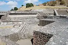 During this time period, there is also evidence of influence from the larger Teotihuacan in the Valley of Mexico.[9][28] However, the exact nature of the relationship between the two cities is not entirely known. One stage of the Great Pyramid is done in talud-tablero architecture, similar to that of Teotihuacan, but the next stage uses a different style, with stairs leading to the top on all four sides. The stage after this one, built during the decline of Teotihuacan, again returns to talud-tablero. Pottery styles between the two cities are similar, especially in the early Classic period, but living spaces and some religious iconography was different. When Teotihuacan declined, Cholula also suffered a significant population decline. At this time, the area took part in the Epi-classic central Mexican culture, and the iconography changes to show Gulf coast influence. Religious focus was kept on the Great Pyramid, but added its own layers to the work.[28]