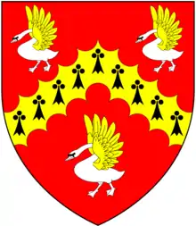 It shows above the arms of Mogg (Argent, on a fess pean between six ermine spots the two exterior in chief and the centre spot in base surmounted by a crescent gules a cock or) quartering Rees (Gules, a chevron engrailed erminois between three swans argent)[6]
