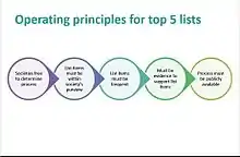 List items recommend practices to be avoided and typically begin with the word "Don't" or "Avoid"; for example, one of the recommendations released in the first wave of the campaign was Don't order screening chest X-rays and ECGs for asymptomatic or low risk outpatients.[20] National specialty societies are free to determine the process for generating their lists, as long as they are done in accordance with the following principles:[1]