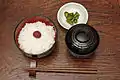 A typical Japanese meal — chopsticks on a chopstick rest at the front side of the dishes, pointing to the left