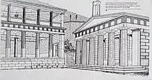 The Choragic Monument of Nikias is a memorial building built in the Acropolis of Athens in 320–319 BCE to commemorate the choregos Nikias, son of Nikodemos.[1] It was situated between the Theatre of Dionysos and the Stoa of Eumenes where its foundations remain along with some fragmentary elements of the structure. It was built in the form of a substantial hexastyle Doric temple with a square cella and might have been surmounted with the prize tripod of the Dionysia.[2] The monument was dismantled at some point in late antiquity and the masonry reused in the Buelé Gate.