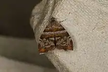 Adults have forewings with a complex pattern of orange, brown, white and grey. The hindwings are a plain brown.