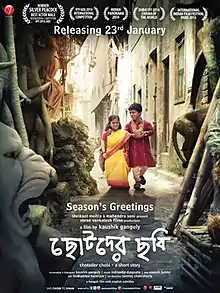 Chotoder Chobi (English: A Story about small people) is a 2014 Indian Bengali language feature film directed by Kaushik Ganguly. The film stars Dulal Sarkar and Deblina Roy in the lead roles. The film is directed by Ganguly and follows his earlier work on Laptop, Shabdo, Apur Panchali and Khaad. The plot revolves around the lives and opinions of a group of dwarfs who work as jokers in a circus.[2] The film was released on 23 January 2015.[3] Produced by Shrikant Mohta of Shree Venkatesh Films, the film's music was scored by Indradeep Dasgupta.[4] The main cast as well as supporting actors were previously non-actors but Sarkar, one of the lead actors in the film, was awarded the best actor award at the 45th International Film Festival of India.It won the National film award for best feature film on other social issues.[3][5]