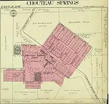 In 1877, a 4-story frame hotel 190 x 45 ft. was built in Chouteau Springs for about $25,000 with C. B. Lakin of Kansas City as the architect. It had a passenger elevator, steam bath, speaking tubes, hardwood, stained glass.[9] In 1906, there was a hotel in Chouteau Springs called the "Hotel Brown".