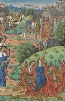 Chram rose in rebellion against his father on several occasions. Following one of these rebellions, he fled with his wife and children to the court of Chanao, the ruler of Brittany. In pursuit of Chram, Chlothar defeated the combined forces of Chanao and his son in battle. Chanao was killed, and Chram, delayed in making his escape by sea because of his concern for his family's safety, was captured. Chlothar gave orders to burn them alive, but Chram was strangled and his body was placed in a cottage,[5] which was subsequently burned. Chlothar reportedly died of remorse later that year.