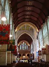 The London firm of Charles Eamer Kempe planned and supplied the Gothic Revival stained glass windows in the nave and baptistry. The firm and its successor, Kempe & Co., were to do so for most of the cathedral's windows over the next three decades, the most celebrated being the western rose window installed in 1928.[1]: 91 [9]: 91 The cathedral would eventually contain more than 60 of the 72 Kempe & Co. windows in the whole of Australia.[10][11] By contrast, in the whole of England the largest remaining collection of stained glass windows from the Kempe studio, in the Church of St Mary Magdalene, Hucknall, Nottinghamshire, has just 20 examples.[12][3]