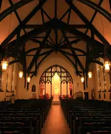 Over the years Christ Church underwent several renovations and refurbishments. In 1900 W. and J. Lamb architects from New York, with Vonnegut and Bohn of Indianapolis acting as supervising architects, renovated and redecorated the church at an approximate cost of $32,294. The architects deepened the chancel, added an exterior porch (lychgate), and designed a new parish house on the west end of the church.[19] Another renovation took place in 1927, when the church's basement was excavated at a cost of $75,000 to create additional space underneath the building for educational and recreational use. Additional renovations took place in 1936. The church's interior and its parish house were refurbished in 1954 at an estimated cost of $300,000 to replace the redecoration made in 1900 because it was incongruent with the church's English Gothic architecture. The church underwent additional renovations in 1973. The church's nave and parish hall were renovated in 1983.[14][20]