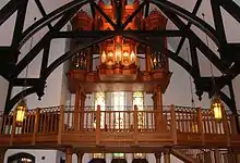 Although the original color of the interior walls is unknown, the beamed ceiling was originally painted light blue. Two panels above the altar included text from "Sanctus." Central pews entered from the sides, but a middle aisle was added later. The church's choir loft was illuminated with leaded-glass windows to the north of the chancel.[25][26]