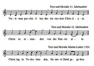 The melody as set by Luther (with help from Walter) seems to have strong correlations with parts of the Eucharistic sequence for Easter, Victimae paschali laudes,[2] believed to have been written by Wipo of Burgundy in the 11th century. This was transformed, gradually into a "Leise", a devotional German pre-Reformation song with a number of stanzas, but maintaining strong characteristics of plainsong.[3]