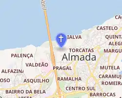 The monument was erected on an isolated clifftop 133 m above the sea, overlooking the Tagus River left bank.[6] It was constructed in the parish of Pragal, which was merged with the parishes of Almada, Cova da Piedade, Pragal e Cacilhas in 2013, into the municipality of Almada. It is the highest point in Almada, on a plateau dominated by the 25 de Abril Bridge, and close to the Estação Elevatória e Reservatório do Pragal.[6] It is accessible from Lisbon by car (over the 25 de Abril Bridge east of the crossing), by train through station in Pragal and by ferry (the Cacilheiro) over the Tagus, through the port of Cacilhas in Almada.