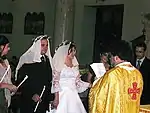 The external sign of the marriage is the placing of wedding crowns upon the heads of the couple, and their sharing in a "Common Cup" of wine. Once crowned, the couple walk a circle three times in a ceremonial "dance" in the middle of the church, while the choir intones a joyous three-part antiphonal hymn, "Dance, Isaiah"