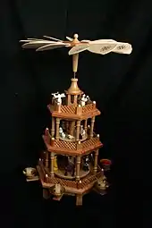It is suggested that the Christmas pyramid is a predecessor of the Christmas tree.[1] These pyramids are not limited to Christmas: in the Erzgebirge there was a custom of dancing around the "St. John's Tree", "a pyramid decked with garlands and flowers", at the summer solstice.[2] Not actually pyramid-shaped, the Christmas pyramid is a kind of carousel with several levels, some depicting Christian motifs such as angels or manger scenes, and others with more secular motifs such as mountain-folk, forests, and other scenes from the everyday life of people in the Erzgebirge. The spinning motion of the pyramids is traditionally achieved with the help of candles whose rising heat spins a propeller above.