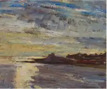 His early work has been described as 'photo realist' in style, while his later works of predominantly landscape subjects are in the modern impressionist or abstract style, showing the influence of previous British landscape painters who eschewed solid objects and detail in favour of expressing the spiritual elements of their subjects, such as J. M. W. Turner.[3]