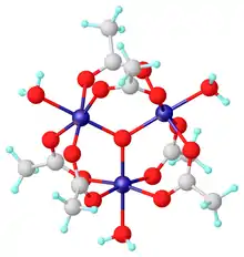 Salts of basic chromium acetate has long attracted interest because of its distinctive structure, which features octahedral Cr(III) centers, a triply bridging oxo ligand, six acetate ligands, and three aquo ligands.[2] The same structure is shared with basic iron acetate and basic manganese acetate.[2][3] Little evidence exists for a simple chromium(III) acetate, i.e. lacking the oxo ligand.[4] Chromium(III) acetate is a blue/grey-green powder, which is soluble in water. It is still[3] prepared according to the original procedure from 1909.[5]