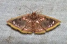 The wingspan is about 20 mm in the male and 26 mm in the female. Antennae of the male are bipectinate (comb like on both sides) to three-fourths length. Hind tibia with two spur pairs. Hindwings with veins 6 and 7 from angle of cell or on a short stalk. Wings with evenly rounded outer margin. Forewings with produced and acute apex. It is generally brownish, but the head, thorax and abdomen are suffused with crimson and the metathorax has two white specks. The forewings have a diffused sub-basal band of pale pink not reaching the costa and with some dark specks on it. A small dark annulus at end of the cell. A submarginal diffused pink band with ill-defined waved dark line on it. Hindwings with sub-basal pink dark-edged band. It has a silvery-white discocellular spot. A diffused postmedial band of pink blotches with some darker marks found on it. Cilia of both wings orange, whereas the ventral side is bright pinkish.[1]