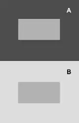 The Chubb illusion is similar to another visual illusion, the contrast effect. The contrast effect is an illusion in which the perceived brightness or luminance of an identical central visual target form on a larger uniform background varies to the test subject depending on the ratio of the central form's luminance to that of its background.[4] This illusion, simultaneous contrast, is illustrated in Figure 2. In it, the central target is brighter. I.e., the ratio of the top central rectangle’s luminance (A) to its background field's luminance is greater than one. In the bottom rectangle (B), the background field is brighter. That is, the ratio is less than one.[2] Although the two central target patches are equally bright (identical in luminance) the one on a dark background appears lighter and the one on a lighter background appears darker.