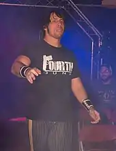 On August 2, Chikara's Director of Fun, Wink Vavasseur, named Sugar Dunkerton, who had announced his wish to join a stable, the fourth member of F.I.S.T.[54] The other members, however, refused to accept Dunkerton as a full-fledged member, instead referring to him as their "water boy".[55][56] On September 14, F.I.S.T., represented by Taylor, Icarus and Gargano, entered the 2012 King of Trios tournament, defeating Team Osaka Pro (Ebessan, Kikutaro and Takoyakida) in their first round match.[40][57] The following day, F.I.S.T. defeated the all-female Team JWP (Command Bolshoi, Kaori Yoneyama and Tsubasa Kuragaki) to advance to the semifinals of the tournament.[40][58] On the third and final day of the tournament, F.I.S.T. was eliminated from the tournament in the semifinals by the Spectral Envoy (Frightmare, Hallowicked and UltraMantis Black), who went on to win the entire tournament.[40][59] In early 2013, the members of F.I.S.T. began having problems with each other, leading to Icarus turning on Gargano on May 3 over his treatment of Sugar Dunkerton.[60][61]