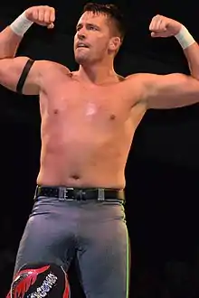 With Omega winning the World Championship at the 2009 BOLA, Taylor and new tag team partner Tornado (having parted ways with Generico after a brief reunion), known collectively as the "2 Skinny Black Guys of Low Moral Fiber", were scheduled to take on the Bucks for the Tag Team championship on January 30, 2010, at WrestleReunion 4, however, due to a snowstorm Taylor was forced to miss the event.[75] The match was rescheduled for PWG's next show, As the Worm Turns, but due to Tornado's sudden retirement from professional wrestling, Taylor would instead partner with Tornado's former partner, and Taylor's former rival, El Generico. They reprised the name 2 Skinny Black Guys of Low Moral Fiber.[76] At the event the Young Bucks defeated Taylor and Generico to retain the Tag Team Titles.[77] While Kenny Omega began spending increased amount of time in Japan, away from PWG, Chuck Taylor went on to form a new alliance in September 2010, called the Fightin' Taylor Boys, with Ryan Taylor and Brian Cage (who would adopt the ring name Brian Cage-Taylor).[78][79] Following the folding of the stable, after Brian Cage went solo, Taylor formed a new stable named Best Friends with Joey Ryan and Trent? in August 2013.[80] On January 31, 2014, Taylor and Trent? defeated three other teams. In the first round defeating the Rockness Monsters (Johnny Yuma and Johnny Goodtime). In the Semi-finals the Best Friends upset Cole Steen Cole (Adam Cole and Kevin Steen) with an assist from Candice Lerae.[81] In the finals the Best Friends defeated the Inner City Machine Guns (Rich Swann and Ricochet) to win the 2014 Dynamite Duumvirate Tag Team Title Tournament.[82] As a result, Taylor and Trent? received a shot at the PWG World Tag Team Championship on March 28, but were defeated by the defending champions, The Young Bucks.[83] In 2015, Taylor began a winning streak, beginning with himself and Trent? defeating The Beaver Boys at "From Out Of Nowhere" and then defeating the likes of Kikutaro, Marty Scurll, and even former partner Trent? in singles action. In December 2016 at "Mystery Vortex IV", the still-unbeaten Taylor earned his first shot at the PWG Championship by defeating Adam Cole in a #1 Contender's match. In February 2017 at "Only Kings Understand Each Other", Chuck Taylor faced champion Zack Sabre Jr in a losing effort. Taylor was attacked after the match by the now-heel Sabre and Marty Scurll, only to see Trent? come to his defense. On July 7, 2017, Taylor defeated Sabre to become PWG World Champion for the first time,[84] only to lose the title to Ricochet on October 21 in his first defense.[85] Taylor would go on to defeat Ricochet and reclaim the PWG World Championship in a Guerrilla Warfare match at PWG Mystery Vortex V. On March 23, 2018, Taylor lost the title against Keith Lee at Time is a Flat Circle.