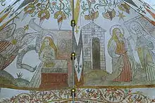 Church frescos or church wall paintings (Danish: kalkmalerier) are to be found in some 600 churches across Denmark, no doubt representing the highest concentration of surviving church murals anywhere in the world.[1] Most of them date back to the Middle Ages and were uncovered by Jacob Kornerup (1825–1913) who carried out restoration work in 80 churches across the country towards the end of the 19th century. They lay hidden for centuries as after the reformation, they were covered with limewash (Danish: kalk) only to be revealed and restored during the course of the 19th and 20th centuries. In most of Europe medieval frescos, extremely common in the Middle Ages, were more likely to be removed completely during the Reformation or in subsequent rebuildings, or merely as they aged. The oldest frescos, dating back to the 12th century, were painted in the Romanesque style by artists from elsewhere in Europe but those from the 14th century and thereafter are in the Gothic style which was used by native Danish painters. It is these that are considered to be the most important for Danish art and culture.[2] A distinction is to be made between these church wall paintings or kalkmalerier and the generic term "fresco" (Danish: fresko) which refers to all types of painting on plastered walls or ceilings.