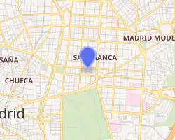 It's located in Goya street, in the corner with Núñez de Balboa street, and its construction was carried out between 1912 and 1914.[3] The architect in charge of church's design was Eugenio Giménez Corera, till his death in 1910. Another architect, Jesús Carrasco, finished the work.[4] The tower —with a 43,70 meter height—[3] is topped with an iron spire, itself crowned by a sculpture of the Immaculate Conception.[1] King Alfonso XIII of Spain and his consort Queen Victoria Eugenie attended the church's opening, the ceremony took place 11 May 1914.[2] The building has suffered several reshuffles: in the decade of 1950s, in 1985 and 2013.[2]