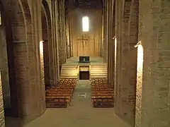 In the interior, a barrel vault of stone covers the nave, which is flanked by two side-aisles. Along the nave, three transverse arches, which are evenly spaced, add support. Their arches continue down the piers as pilasters, complete with capitals at the springing of the arch. Rounded arches, supported by piers, open into the side aisles, which are covered with stone groin vaults. Above the nave arcade, small rounded lancet-shaped windows pierce the stone walls. The windows are evenly spaced over the arch openings.