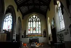 In 1724 work began to change the church roof from tiles to lead, work that was completed in 1758; until this point the church had a three-span roof but this work saw the roof assuming the one-span structure that is maintained to the current day.[22] In 1742 the plain window on the northern wall behind the pulpit was replaced "with a Square Crown Glass in order to give it better light, and also to alter the Sounding Board in such a manner as shall be thought most proper upon the opinion of the Revd. Mr. Smith, Vicar, and the workman."[22] According to Couper, the housekeeping records during this century became "more meticulous than ever"; records were kept of the monies received for each member of the congregation ("1/- for each person 'seated' in the Church or Churchyard, and 3/4 for a child's")[23] as well as for items such as "a pound of soft soap" (7d), "oyle" (3d) and "a chamber pott" (9d).[23]