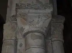 The present-day church had its origins in the Norman period, with building probably starting at some time not long after 1066.[2] The conventional date for the founding of the church is 1070, and the church celebrated its 900th anniversary in 1970. This early church took the shape of a cross, the four Norman arches that formed the tower being described in Pevsner as "emphatically Early Norman, say around 1100".[3] These arches, built of stone probably from Selborne or Binsted,[4] are situated midway down what is now the southern nave, and some remnants of the original door may be seen in the wall behind the 19th-century font located in the centre of the arches.[2] At the top of the pillars supporting the arches are designs fashioned by French craftsmen with axes,[2] including a wolf eating a bone (pictured, below left), a pelican, several winged cherubs, a demon and a pair of donkeys.[2]