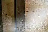 In the southwest corner of the nave can be found part of a 13th-century limestone marble slab, with an undeciphered inscription in Lombardic capitals along one margin. The communion rails were fitted at the bequest of William Meadston (died 1683). The door in the ground stage of the tower is formed of two leaves and is late-medieval, and originally was fitted in the west doorway. Prior to the restoration of 1880 there were two baptismal fonts in the church: one in the present position and one in the centre aisle. The present 13th-century font has an octagonal limestone marble bowl with two pointed arched panels in each face. The font's base has a cylindrical central pier with 19th-century peripheral shafts. The font's sub-base possibly incorporates the bowl of the earlier font which may well have been in use in the earliest church on this site.[4] The restored octagonal ogee font cover with crocketed ribs and finial is probably 16th-century.[1][2][4]