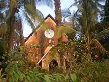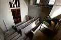 The tower has four floors, of which the ground floor doubles as the church's porch.[22] The first floor is the children's gallery; this has a stepped floor to accommodate the pews, leaving a large, wedge-shaped cavity between the ground floor ceiling and the surface for the seating. The children's gallery is well-lit by large windows, and is open to the nave, forming a balcony overlooking the pulpit. The opening to the nave was closed off around 1984 with a screen and door. The gallery is accessed separately from the nave via the tower's staircase, allowing the Sunday School children to be brought into the gallery and taken away to lessons without disturbing the service. This gallery is long disused and the steps beside the pews have become rotten and unsafe.[23] The second floor is the clock chamber, containing an 1889 turret clock mechanism by Potts of Leeds, who as of 2014 continue to maintain it. The clock chamber has no windows and is completely dark.[24] The bell chamber is on the third floor and contains the single bronze bell and clapper for the clock.[25]