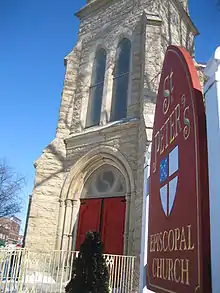 The Sycamore, Illinois St. Peter's Episcopal Church is listed as another contributing structure to the overall historic integrity of the Sycamore Historic District. The historic district was designated in 1978 when it joined the National Register of Historic Places. The church building was designed by Chicago architect George O. Garnsey. It was erected in 1878 and consecrated in 1879 as a memorial to its primary benefactor Sycamore businessman James Waterman. Waterman paid the entire $17,000 construction cost himself.[7] The building is said to be the oldest church in DeKalb County.[7] Constructed from Batavia stone the building's distinctive architectural integrity has been maintained through the years. It still features original walnut pews and stained glass.[7]