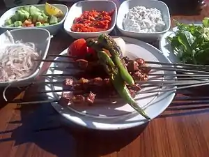 Liver is served in different ways in Turkish cooking, and can be found on its own as a main course in a sizzling plate,[1] or as a kebab on shish skewers.[2] Ciğer kebab is not specific to any particular region of Turkey, but is common in cities like Gaziantep[3][4] and Diyarbakir.[5][6]