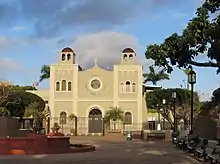 Located across from the central plaza is the Parroquia Nuestra Señora del Carmen (English: Our Lady of Mount Carmel Parish), a Roman Catholic church. The first church made of wood was built in 1815. In 1867, a second church was built but was destroyed by an earthquake soon after. Pedro Cobreros designed the next church which was built in 1895. The current structure with a new facade was completed in 1952 and the lateral naves were added at that time.[16]