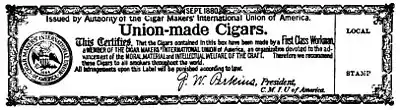 The first local Cigar Makers' Union was founded in Baltimore, Maryland in 1851 by craftsmen who were opposed to the importation of low-cost laborers from Germany.[1] This was followed two or three years later by the establishment of a New York Cigarmakers' Union of about 70 members, mostly emigrants from England or Germany. This group quickly expanded in size to include about 160 of the city's 800 or so cigar workers before collapsing in an unsuccessful strike to avert a general cut in wages.[1]