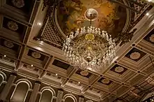 Springer Auditorium also houses the iconic Music Hall Chandelier. The Czechoslovakian piece was sent to the United States in pieces, and was officially installed in Springer Auditorium in the early 1970s. It was found and purchased by the Corbett Family as they financed the multi-year renovation of the auditorium. The chandelier weighs approximately 1,500 pounds with a diameter of 21 feet. It also includes 96 candles, each lit with an individual bulb.[5]