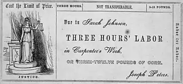 In the store, customers could purchase goods with "labor notes" which represented an agreement to perform labor.[5] The items in the store were initially marked up 7% to account for the labor required to bring them to market with the price increasing the longer the time that a customer spent with the shopkeeper, as measured by a timer dial; later this markup was reduced to 4%. Corn was used as a standard, with 12 pounds of corn being exchangeable with one hour of labor. The result of the system was that no one was able to profit from the labor of another — every individual ostensibly received the "full produce" of his labor. Adjustments were made for the difficulty and disagreeableness of the work performed, so that time was not the only factor taken into consideration. Warren also set up boards on the wall where individuals could post what kind of services they were seeking or had to sell so that others could respond, and trade among each other using labor notes.[10]