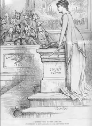 Corruption was a serious problem in Cincinnati at that time, with local leaders notorious for controlling elections and manipulating judges and juries.[4] In March 1884, the city was still reeling from a devastating flood the previous month when the river crested at 71.9 feet (21.9 m).[5] A full-page article published in The Cincinnati Enquirer on March 9, 1884, said: "Laxity of laws gives the Queen City of the West its crimson record. Preeminence in art, science, and industry avail nothing where murder is rampant and the lives of citizens are unsafe even in broad daylight."[6]