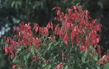 The tree grows to 10–15 m (33–49 ft) tall, with greyish bark and hard, elongated leaves that are 10–15 cm (3.9–5.9 in) long and reddish when young.