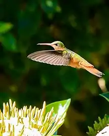 The cinnamon hummingbird's breeding season varies throughout its range; every month is represented somewhere. Its nest is a cup made of plant material and spider web placed on a horizontal branch. Three nests in western Mexico had a small platform of wood pieces under the cup. The cup was made of kapok seed fibers with grass, bits of wood, and lichens on the outside. All three were in semi-deciduous forest. The clutch size is two eggs, but little more is known about the species' breeding phenology.[5][6]