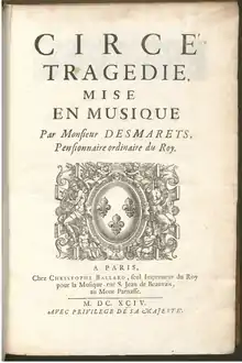 Circe was first performed in 1694 at the Paris Opera.[2] It was not received well; most of Desmarets' operas were said to have mimicked Lully's music in a way that produced material similar but inferior to it. No fault of Desmarets', Lully's monopoly on court music cast a shadow in which any potential individuality Desmarets had was quashed. This may have contributed to the generally negative sentiment toward his work evident in reviews written at the time.[3][4]