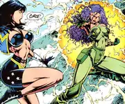 One attempt Circe made in trying to destroy Diana involved a disguise as a mortal lawyer named Donna Milton.[20] In this persona, she could get close enough to Diana in order to kill her when her defenses were low. Afraid that Diana would see through her disguise with her power of truth, Circe cast a spell on herself. The spell made Circe believe that she actually was Donna Milton and her true persona would only return when Donna could strike.[21] As Donna Milton, she was hired by the mobster Ares Buchanan, who was really the god Ares in disguise himself. During their time together, they formed a romantic relationship and Donna became pregnant. As Donna, Circe actually became a good friend of Diana and ended up saving her life from Ares. He was sucked into a miniature black hole while Donna went into labor. No longer working for Ares, Donna gave birth to her daughter Lyta Milton[22] and became Diana's lawyer at her and Micah Rains' new detective agency.[23] When the Amazon Artemis single-handedly battled the White Magician, Diana realized that Donna was actually Circe and begged her to help transport her to Artemis' side. Not believing Diana and hurt that her friend would think her to be a villain, Donna yelled at Diana to leave and subconsciously teleported Diana to Artemis. Shocked, Circe's memories slowly began coming back to her. Still possessing some of Donna's false memories, she teleported herself to Diana in order to help her in her battle, but she was not on top of her game as she still had ties to her Donna Milton body, and the White Magician was not affected by her magical attacks. She used the remainder of her power to save Diana by teleporting herself, a demonically altered Cheetah, and Cassandra Arnold, a television reporter and the White Magician's lover, away from the battle, leaving her last words to Diana be "You're my only friend, Diana".